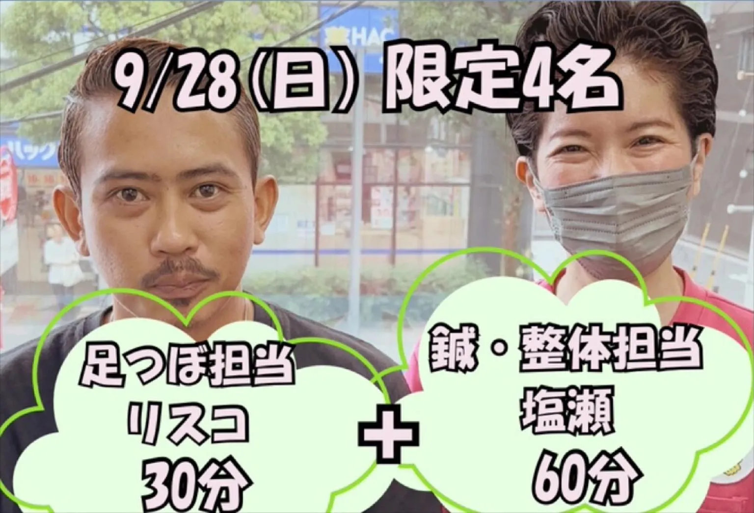 塩瀬の鍼整体60分プラスリスコの足のマッサージ30分